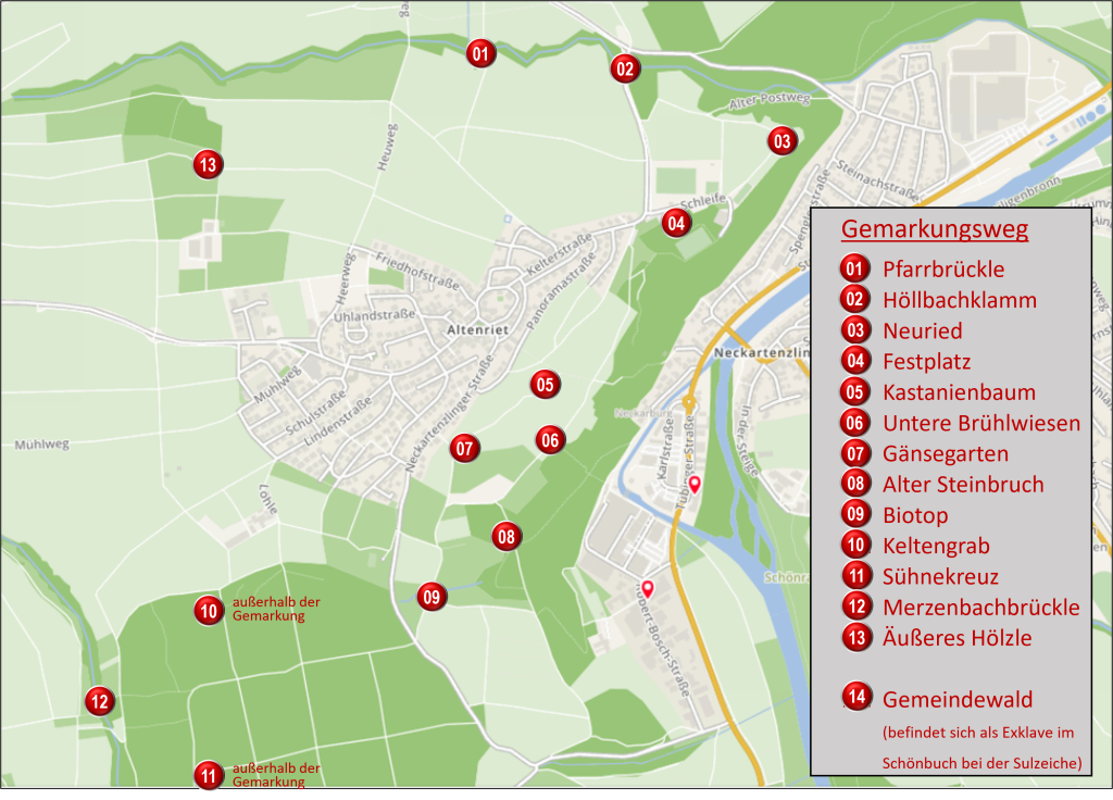 Bürgerforum Altenriet Gemarkungsweg Pfarrbrückleversteckte GeisterMerzenbachbrückleBrühlwiesen Altenriet erkunden Obwohl Altenriet im Landkreis Esslingen eine der flächenmäßig kleinsten der 44 Gemeinden ist, so gibt auf der Gemarkung doch sehr viel zu entdecken. 9,3 km, 2,5 h, nicht barrierefrei (180 hm) Markante Punkte Pfarrbrückle Höllbachklamm Neuried Festplatz Kastanienbaum Untere Brühlwiesen Gänsegarten Alter Steinbruch Biotob Keltengrab Sühnekreuz Merzenbachbrückle Äußeres Hölzle Gemeindewald