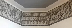 Oberhalb der Chorfenster dann eine Steininschrift zu den Glasgemälden.