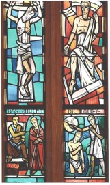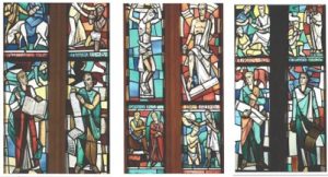 Das mittlere Fenster zeigt die Taufe Jesu, Jesus vor Gericht, Jesus am Kreuz und die Auferstehung.