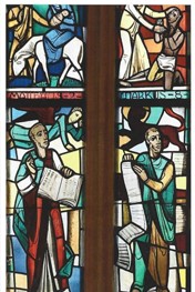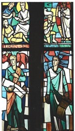 In den beiden Seitenfenstern sind beinahe spiegelbildlich im unteren Bereich die vier 4 Evangelisten (Matthäus, Markus, Lukas, Johannes) abgebildet, die das im mittleren Bild Gezeigte bezeugen. Jeder hält eine Schriftrolle in der Hand und blickt zum Gekreuzigten und Auferstandenen.