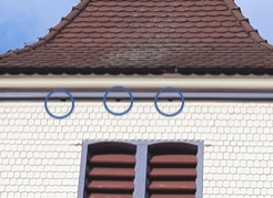 An der Westseite des Kirchturms befinden sich oberhalb der Schallläden drei Einflugöffnungen für Mauersegler und andere Bewohner der Kirchturmspitze.