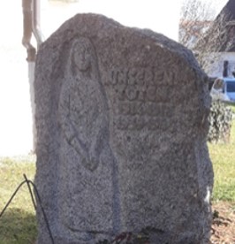 Rechts unter dem 1958 gepflanzten Mammutbaum sieht man den Gedenkstein der Gefallenen vom 1. und 2. Weltkrieg.